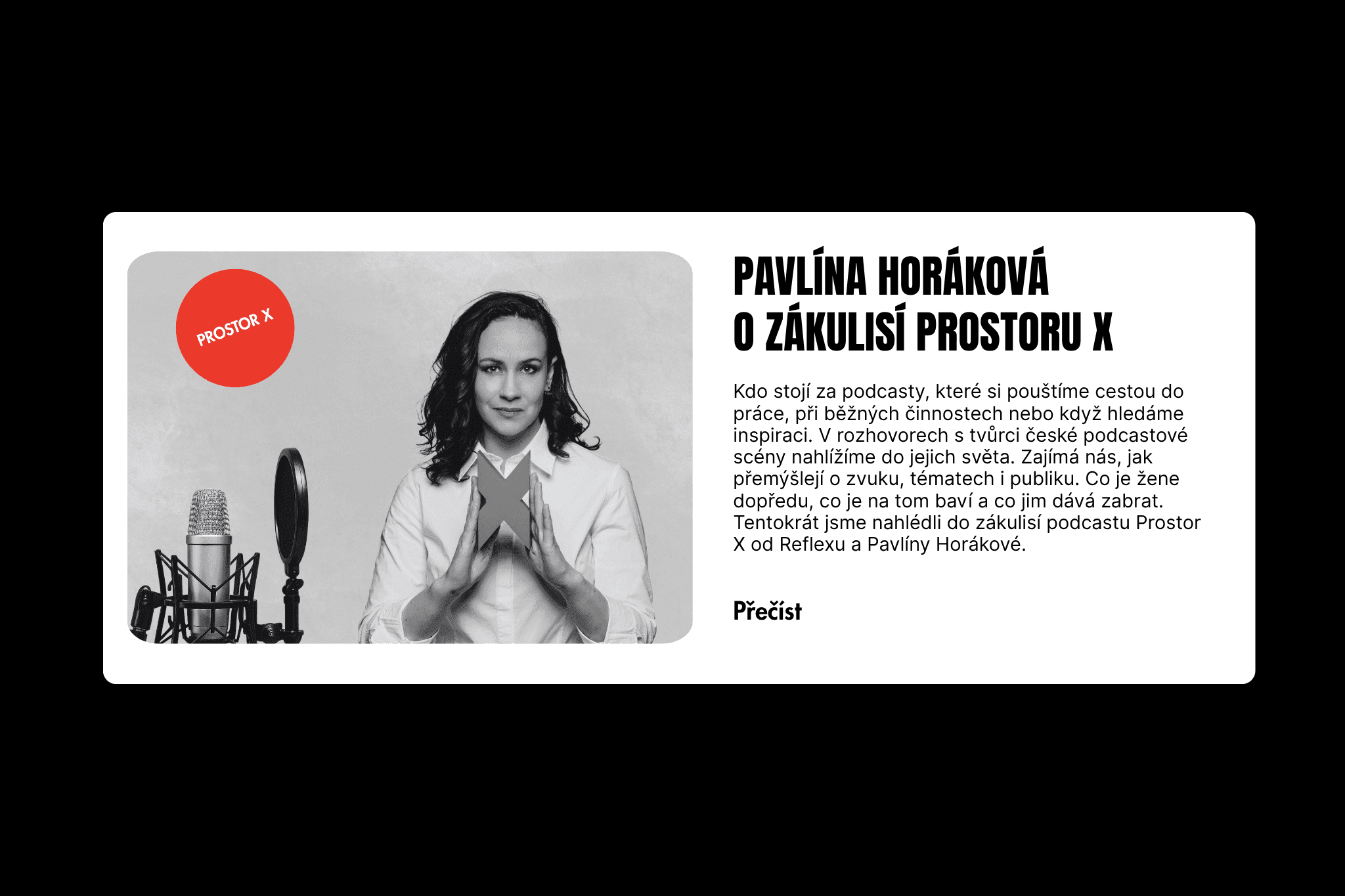 Kdo stojí za podcasty, které si pouštíme cestou do práce, při běžných činnostech nebo když hledáme inspiraci. V rozhovorech s tvůrci české podcastové scény nahlížíme do jejich světa. Zajímá nás, jak přemýšlejí o zvuku, tématech i publiku. Co je žene dopředu, co je na tom baví a co jim dává zabrat. Tentokrát jsme nahlédli do zákulisí podcastu Prostor X od Reflexu a Pavlíny Horákové.